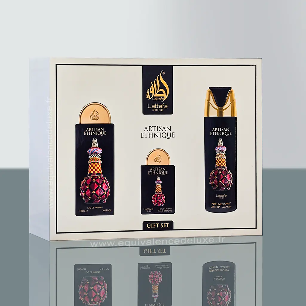 Coffret Artisan Ethnique – Lattafa Pride : une création orientale boisée aux nuances épicées et chaudes. Parfum 100 ml + mini 25 ml + déodorant + atomiseur doré. Longue tenue, mixte et idéal en cadeau parfumé, souvent recherché comme dupe ou équivalent de fragrances orientales prestigieuses.