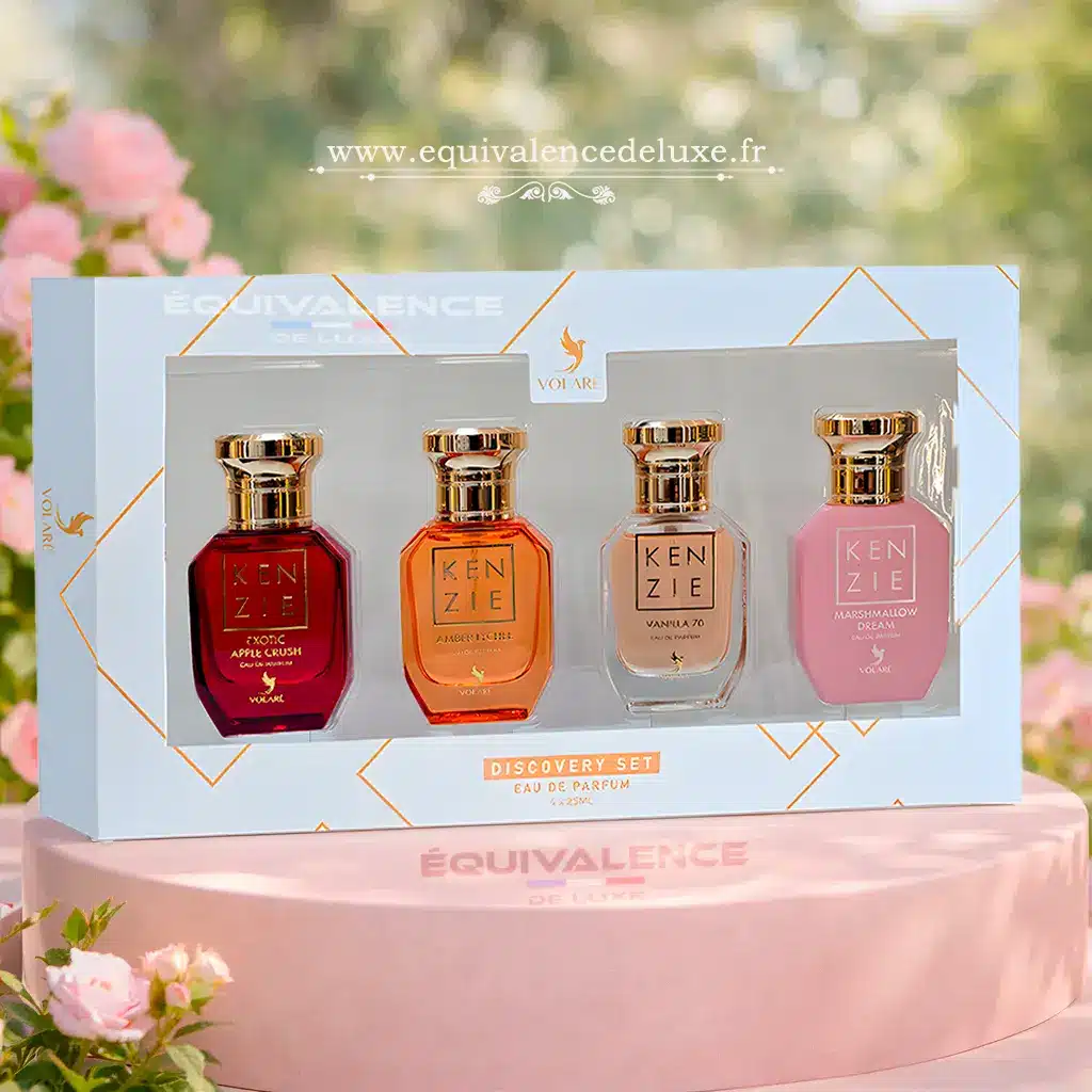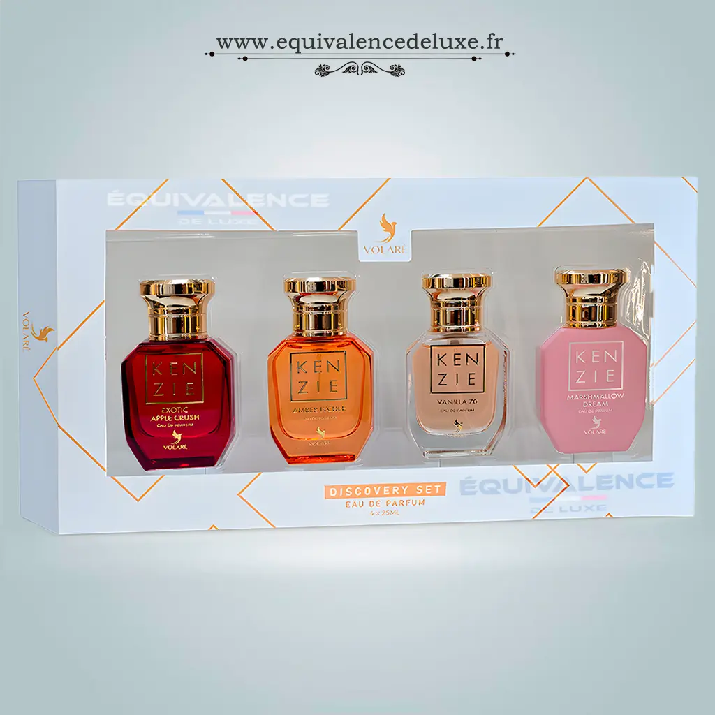 Découvrez le coffret Kenzie Discovery Set, une sélection de 4 mini parfums</strong aux univers fruités, gourmands et sucrés. Parfait pour explorer différentes senteurs et trouver votre signature olfactive.