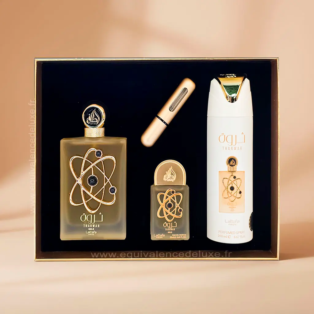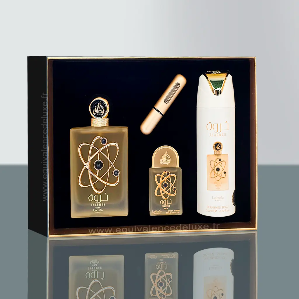 Coffret Tharwah Gold – Lattafa Pride : une fragrance orientale vanillée au style ambré et floral, intense et élégante. Format 100ml + mini 25ml + déodorant + atomiseur. Un dupe premium, longue tenue, mixte et idéal en cadeau parfumé.