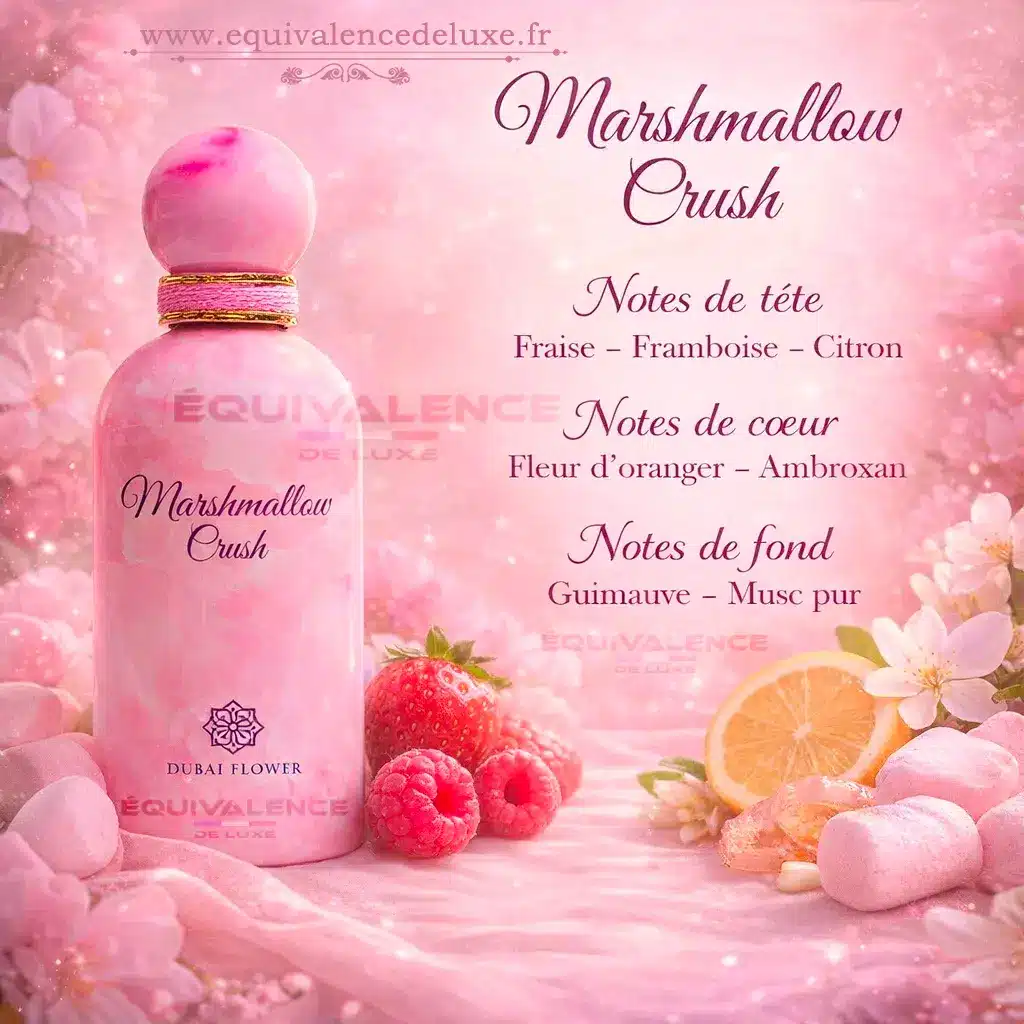 Grâce à ses notes fruitées et légères, Marshmallow Crush est particulièrement agréable durant les saisons chaudes. Il peut être porté au quotidien pour une signature parfumée douce et lumineuse.